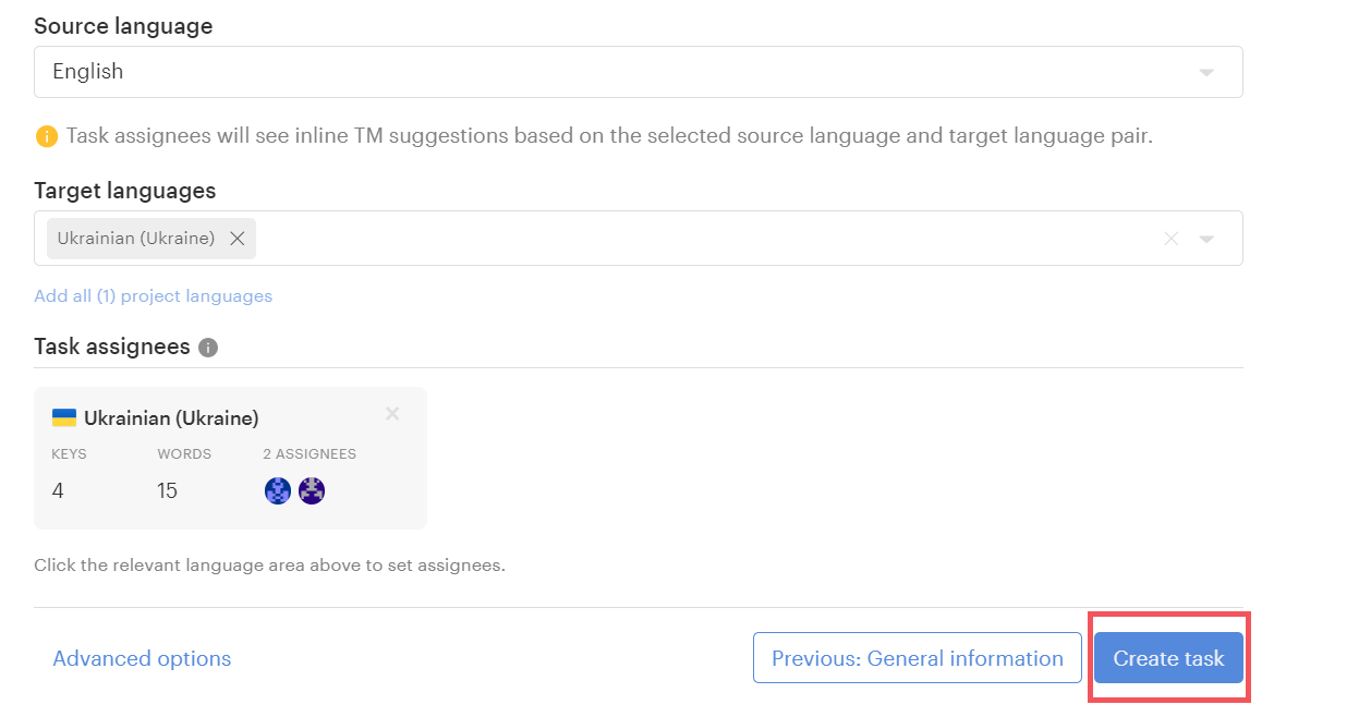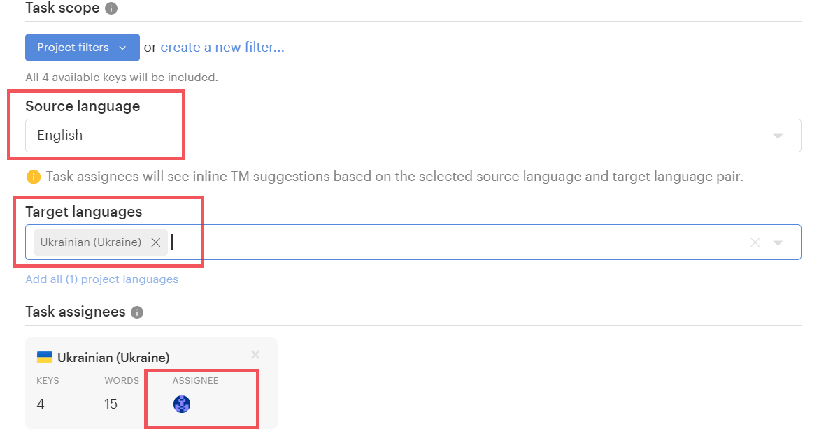 2. Choose the language pair and assign BLEND's user and Translator’s user to the Task: