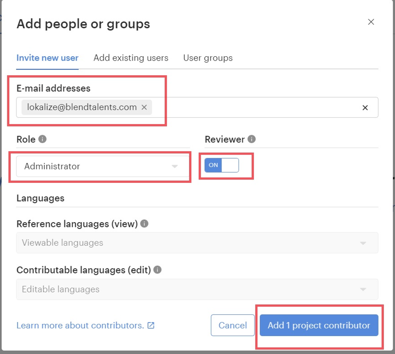 2. Add BLEND’s user lokalize@blendtalents.com as a contributor with Admin rights (with the Review rights on) to the Contributors of the project: